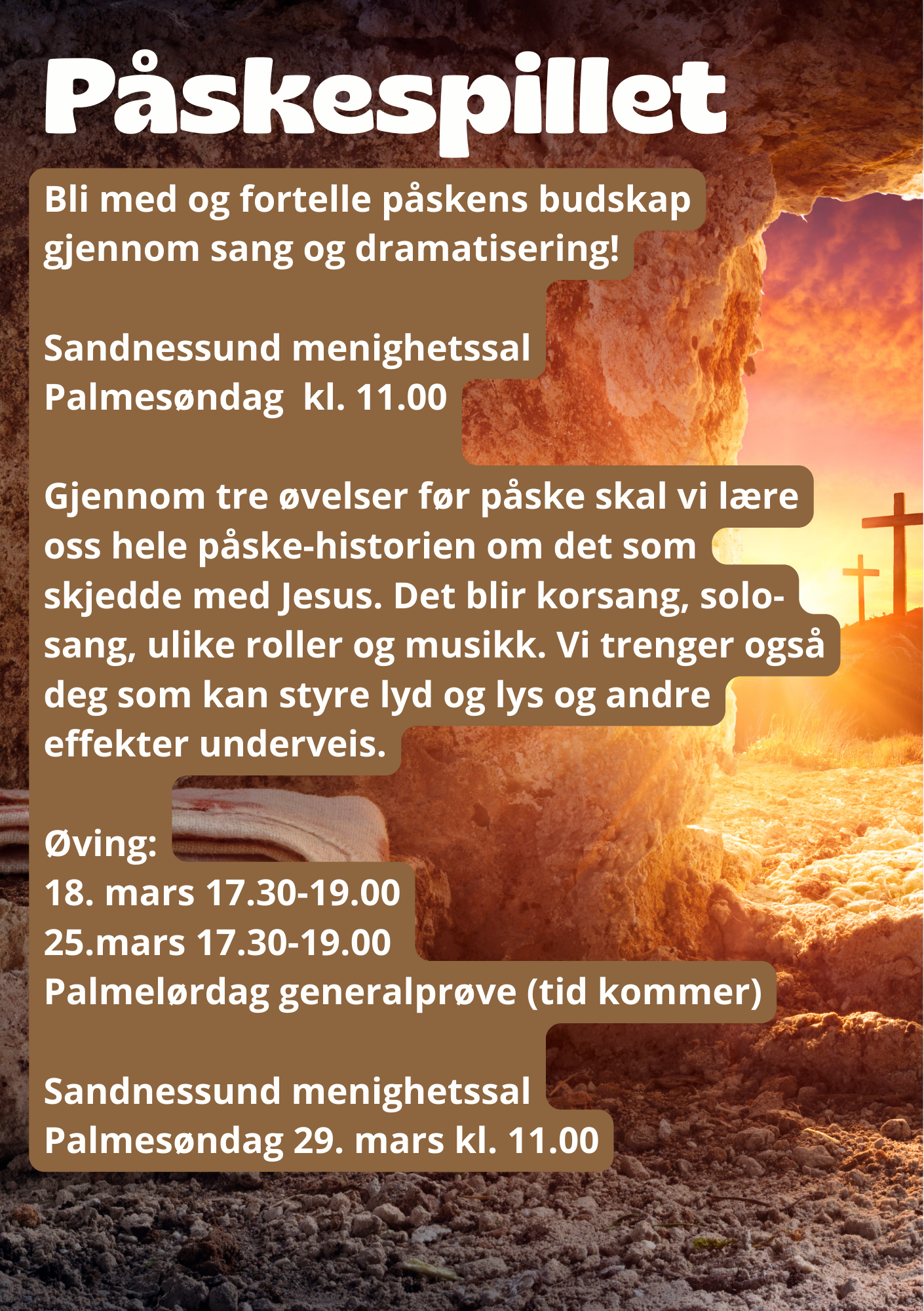 Gjennom tre øvelser før påske skal vi lære oss hele påske-historien om det som skjedde med Jesus. Det blir korsang, solo-sang, ulike roller og musikk. Vi trenger også deg som kan styre lyd og lys og andre effekter underveis.
