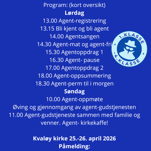 Vi er agenter sammen, har mange ulike aktiviteter og utfordringer! Vi koser oss med god mat og litt lørdagsgodt. På søndag lager vi agent-gudstjeneste som alle foreldre, foresatte, faddere, søsken, besteforeldre og venner er hjertelig velkommen til å være med på!