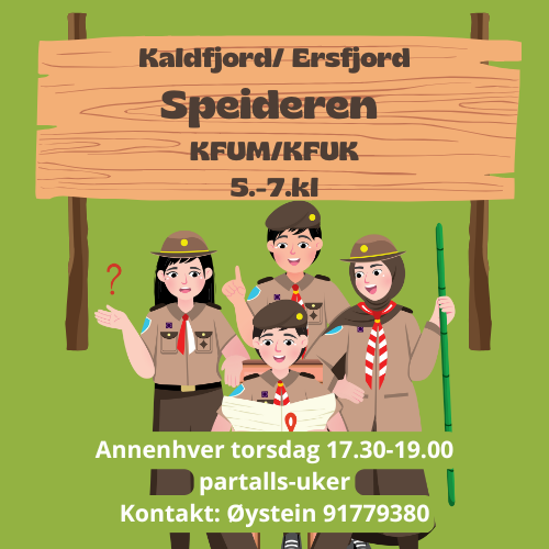 Bli med på speidersamlinger ute i vår flotte natur rundt Ersfjorden og Kaldfjorden der vi lærer å bruke naturen på en bærekraftig måte, lærer å være ute og å bruke redskaper for å lage mat, ly og varme. Det blir godt fellesskap, andakt og god stemning.