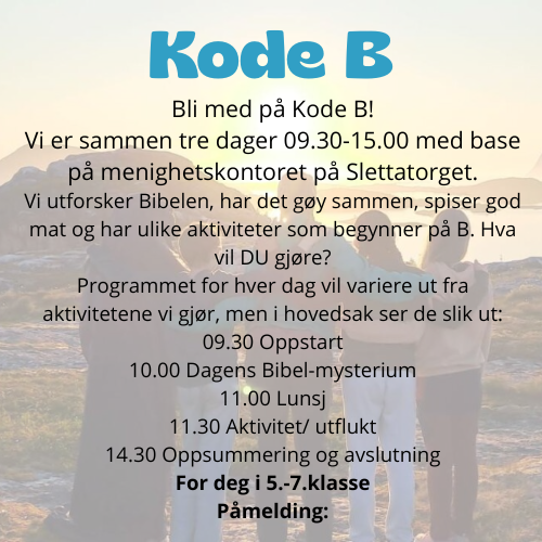 Bli med på tre spennende dager der vi utforsker Bibelens koder og finner på mange ulike aktiviteter på B! 22.-24.juni med samlinger 09.00-15.00 hver dag.